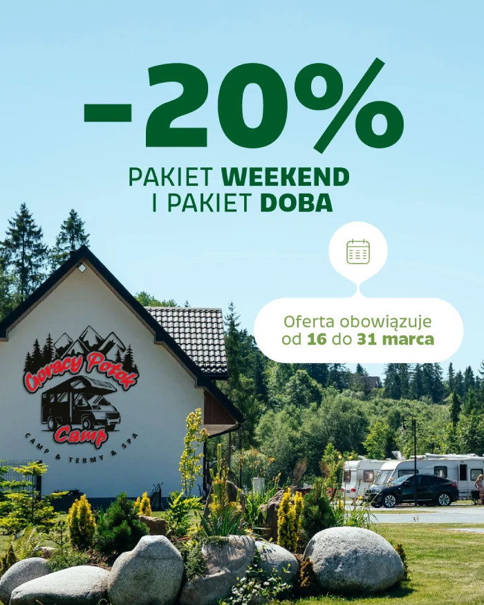Od 16 do 31 marca w Camp Gorący Potok obowiązuje promocja -20% na pakiety pobytowe połączone z wejściem do strefy basenowej w Termach Gorący Potok. Rabat dotyczy dwóch najpopularniejszych opcji pobytu: pakietu DOBA oraz pakietu WEEKEND.