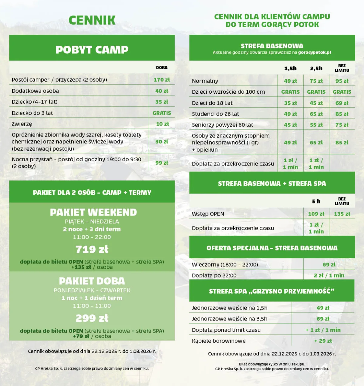 CENNIK Sprawdź aktualne ceny w Camp Gorący Potok Cennik - Camp Gorący Potok zachęcamy do wcześniejszej rezerwacji parceli. Postój camper / przyczepa (2os.) (wydzielona parcela z przyłączami do prądu i wody) 170 zł Dodatkowa osoba dorosła 40 zł Dziecko do 18 lat 35 zł Dziecko do 3 lat (w przypadku rezerwacji online prosimy nie uwzględniać w rubryce „ilość osób”) gratis Zwierzę 10 zł Opróżnienie zbiornika wody szarej, kasety toalety chemicznej oraz napełnienie świeżej wody (bez rezerwacji postoju) 30 zł Nocna przystań (2os.) – postój od godziny 19:00 do 9:30 (wydzielona parcela z przyłączami do prądu i wody) 99 zł Cennik dotyczy doby postojowej (11:00 – 11:00) * przy rezerwacji parceli powyżej 7 nocy – 10% rabatu na cały pobyt Opłata za postój kampera zawiera podłączenie do prądu na parceli podłączenie do wody na parceli dostęp do ogrzewanego sanitariatu (WC, wyposażona kuchnia, prysznice, pralnia, suszarnia) możliwość zatankowania wody świeżej zrzut wody szarej możliwość opróżnienia kasety toalety Pakiety CAMP + TERMY (2os.) - cennik Cennik – sezon wysoki ważny od 22.12.2025 do 01.03.2026 Doba – obowiązuje od poniedziałku do czwartku (11.00 – 11.00)(Cena za dodatkową osobę według cennika postojowego + cennika na Termy dla gości Campu) 299 zł / 2os Weekend – obowiązuje od piątku do niedzieli (11.00 – 22.00)(Cena za dodatkową osobę według cennika postojowego + cennika na Termy dla gości Campu) 719 zł / 2os Pakiet zawiera postój campera na wydzielonej parceli dla 2 osób Pakiety zawierają wejście na strefę basenową Term Gorący Potok bez limitu czasu przez cały okres pobytu w godzinach obowiązywania pakietu Cena pakietów zawiera wstęp na wszystkie imprezy organizowane na strefie basenowej Term Gorący Potok Cennik na pozostałe usługi Cennik – sezon wysoki ważny od 22.12.2025 do 01.03.2026 Promocja urodzinowa w dniu urodzin wejście na strefę basenową Term Gorący Potok bez limitu czasu - za 1 zł Cennik Term Gorący Potok dla gości Campu Cennik niski obowiązuje od 01.09.2024 sezon niski STREFA BASENOWA 1,5 h 2,5 h bez limitu Normalny 45 zł 69 zł 89 zł Dzieci o wzroście do 100cm gratis gratis gratis Dzieci do 18 lat 29 zł 39 zł 65 zł Studenci do 26 lat 39 zł 55 zł 79 zł Seniorzy powyżej 60 lat 35 zł 49 zł 69 zł Osoby ze znacznym stopniem niepełnosprawności (Igr) + opiekun 39 zł 55 zł 79 zł Dopłata po przekroczeniu czasu – 0,50 zł/minPo godzinie 22.00 naliczana jest dodatkowa opłata 2zł/min STREFA BASENOWA Normalny 1,5h 2,5h bez limitu 45 zł 69 zł 89 zł Dzieci do 100cm wzrostu 1,5h 2,5h bez limitu gratis gratis gratis Dzieci do 18 lat 1,5h 2,5h bez limitu 29 zł 39 zł 65 zł Studenci do 26 lat 1,5h 2,5h bez limitu 39 zł 55 zł 79 zł Seniorzy powyżej 60 lat 1,5h 2,5h bez limitu 35 zł 49 zł 69 zł Osoby ze znacznym stopniem niepełnosprawności (Igr) + opiekun 1,5h 2,5h bez limitu 39 zł 55 zł 79 zł Dopłata po przekroczeniu czasu – 1zł/minPo godzinie 22.00 naliczana jest dodatkowa opłata 2zł/min BILETY OPEN (strefa basenowa + strefa SPA) Bilet OPEN 5h 99 zł Bilet OPEN bez limitu 125 zł Dopłata po przekroczeniu czasu – 0,50 zł/minPo godzinie 22.00 naliczana jest dodatkowa opłata 2zł/min OFERTA SPECJALNA Bilet wieczorny 18.00 – 22.00 65 zł Po godzinie 22.00 naliczana jest dodatkowa opłata 2zł/min STREFA SPA „Grzysno Przyjemność” niski sezon niski Wejście na 1,5h 45 zł Wejście na 3,5h 65 zł Kąpiele borowinowe 25 zł Sauny oraz kąpiele prywatne nie podlegają rabatowaniudopłata za strefę basenową +1zł/1min po przekroczeniu 15 min Skontaktuj się z Camp Gorący Potok Email camp@goracypotok.pl Telefon +48 883 122 223 Email camp@goracypotok.pl Telefon +48 883 122 223 Godziny otwarcia Codziennie: 9:00 - 22:00 Skorzystaj z formularza [contact-form-7 id="3679" title="Formularz 1"] Jak dojechać do Camp Gorący Potok?