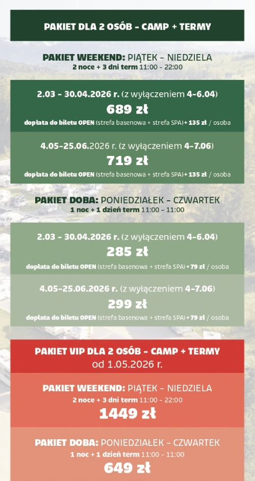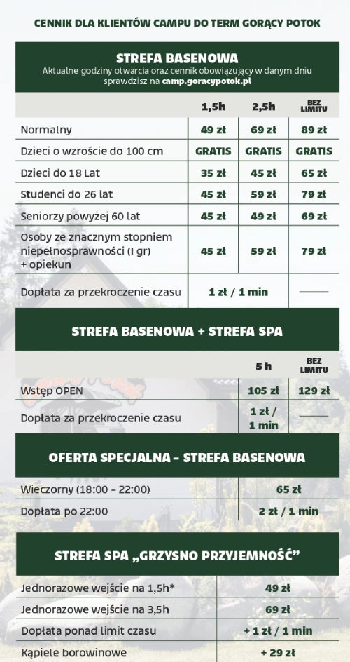 CENNIK Sprawdź aktualne ceny w Camp Gorący Potok Cennik - Camp Gorący Potok zachęcamy do wcześniejszej rezerwacji parceli. Postój camper / przyczepa (2os.) (wydzielona parcela z przyłączami do prądu i wody) 170 zł Dodatkowa osoba dorosła 40 zł Dziecko do 18 lat 35 zł Dziecko do 3 lat (w przypadku rezerwacji online prosimy nie uwzględniać w rubryce „ilość osób”) gratis Zwierzę 10 zł Opróżnienie zbiornika wody szarej, kasety toalety chemicznej oraz napełnienie świeżej wody (bez rezerwacji postoju) 30 zł Nocna przystań (2os.) – postój od godziny 19:00 do 9:30 (wydzielona parcela z przyłączami do prądu i wody) 99 zł Cennik dotyczy doby postojowej (11:00 – 11:00) * przy rezerwacji parceli powyżej 7 nocy – 10% rabatu na cały pobyt Opłata za postój kampera zawiera podłączenie do prądu na parceli podłączenie do wody na parceli dostęp do ogrzewanego sanitariatu (WC, wyposażona kuchnia, prysznice, pralnia, suszarnia) możliwość zatankowania wody świeżej zrzut wody szarej możliwość opróżnienia kasety toalety Pakiety CAMP + TERMY (2os.) - cennik Cennik ważny od 02.03.2026. Doba – obowiązuje od poniedziałku do czwartku (11.00 – 11.00)(Cena za dodatkową osobę według cennika postojowego + cennika na Termy dla gości Campu) 285 zł / 2os Weekend – obowiązuje od piątku do niedzieli (11.00 – 22.00)(Cena za dodatkową osobę według cennika postojowego + cennika na Termy dla gości Campu) 689 zł / 2os Pakiet zawiera postój campera na wydzielonej parceli dla 2 osób Pakiety zawierają wejście na strefę basenową Term Gorący Potok bez limitu czasu przez cały okres pobytu w godzinach obowiązywania pakietu Cena pakietów zawiera wstęp na wszystkie imprezy organizowane na strefie basenowej Term Gorący Potok Cennik na pozostałe usługi Cennik ważny od 02.03.2026 do 26.06.2026. Promocja urodzinowa w dniu urodzin wejście na strefę basenową Term Gorący Potok bez limitu czasu - za 1 zł Cennik Term Gorący Potok dla gości Campu Cennik niski obowiązuje od 01.09.2024 sezon niski STREFA BASENOWA 1,5 h 2,5 h bez limitu Normalny 45 zł 69 zł 89 zł Dzieci o wzroście do 100cm gratis gratis gratis Dzieci do 18 lat 29 zł 39 zł 65 zł Studenci do 26 lat 39 zł 55 zł 79 zł Seniorzy powyżej 60 lat 35 zł 49 zł 69 zł Osoby ze znacznym stopniem niepełnosprawności (Igr) + opiekun 39 zł 55 zł 79 zł Dopłata po przekroczeniu czasu – 0,50 zł/minPo godzinie 22.00 naliczana jest dodatkowa opłata 2zł/min STREFA BASENOWA Normalny 1,5h 2,5h bez limitu 45 zł 69 zł 89 zł Dzieci do 100cm wzrostu 1,5h 2,5h bez limitu gratis gratis gratis Dzieci do 18 lat 1,5h 2,5h bez limitu 29 zł 39 zł 65 zł Studenci do 26 lat 1,5h 2,5h bez limitu 39 zł 55 zł 79 zł Seniorzy powyżej 60 lat 1,5h 2,5h bez limitu 35 zł 49 zł 69 zł Osoby ze znacznym stopniem niepełnosprawności (Igr) + opiekun 1,5h 2,5h bez limitu 39 zł 55 zł 79 zł Dopłata po przekroczeniu czasu – 1zł/minPo godzinie 22.00 naliczana jest dodatkowa opłata 2zł/min BILETY OPEN (strefa basenowa + strefa SPA) Bilet OPEN 5h 99 zł Bilet OPEN bez limitu 125 zł Dopłata po przekroczeniu czasu – 0,50 zł/minPo godzinie 22.00 naliczana jest dodatkowa opłata 2zł/min OFERTA SPECJALNA Bilet wieczorny 18.00 – 22.00 65 zł Po godzinie 22.00 naliczana jest dodatkowa opłata 2zł/min STREFA SPA „Grzysno Przyjemność” niski sezon niski Wejście na 1,5h 45 zł Wejście na 3,5h 65 zł Kąpiele borowinowe 25 zł Sauny oraz kąpiele prywatne nie podlegają rabatowaniudopłata za strefę basenową +1zł/1min po przekroczeniu 15 min Skontaktuj się z Camp Gorący Potok Email camp@goracypotok.pl Telefon +48 883 122 223 Aby wypełnić ten formularz, włącz obsługę JavaScript w przeglądarce.Imię i nazwisko *Email * wiadomości Treść Imię Treść wiadomości *Zgoda na przetwarzanie danych osobowych *Wyrażam zgodę na przetwarzanie moich danych osobowych w celu kontaktu w związku ze złożonym zapytaniem lub zgłoszeniem przesłanym przez formularz kontaktowy. Zgoda na przetwarzanie danych osobowych jest dobrowolna, a podane dane zostaną przetworzone zgodnie z Polityką Prywatności firmy.Wyślij wiadomość Jak dojechać do Camp Gorący Potok?