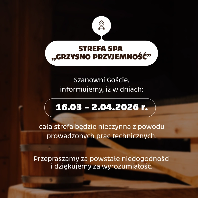 Informujemy, że w dniach 16 marca – 2 kwietnia strefa SPA & Wellness „Grzysno Przyjemność” w kompleksie Term Gorący Potok będzie czasowo wyłączona z użytkowania z powodu przerwy technicznej.