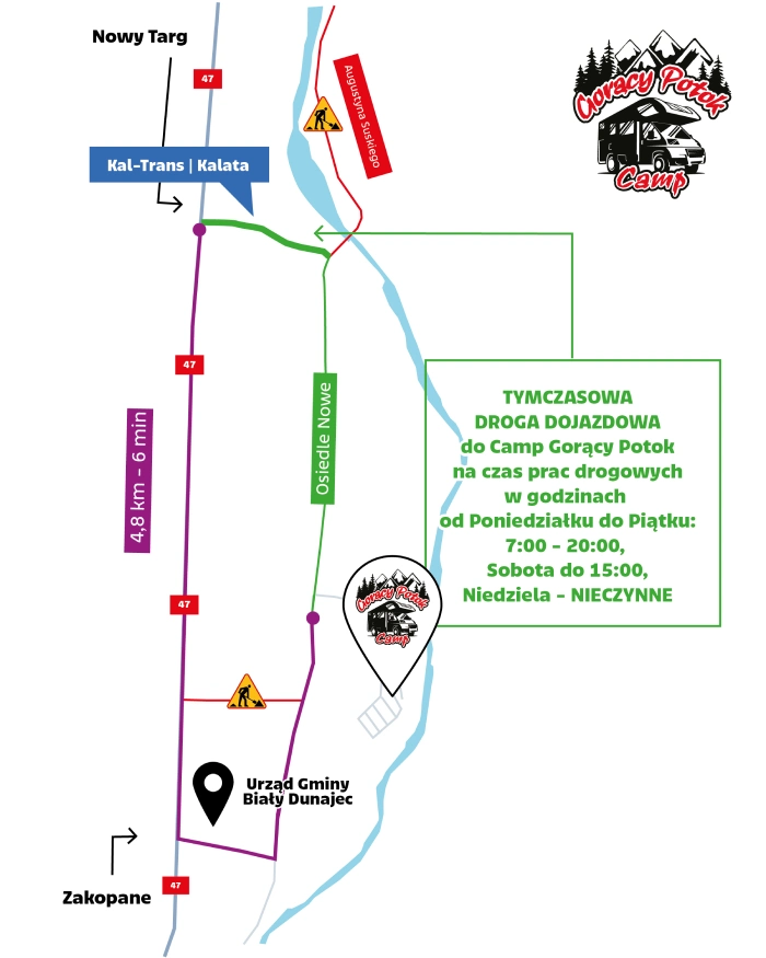 Całodobowo dostępny jest również szeroki zjazd od strony Białego Dunajca – obok budynku Urzędu Gminy, który prowadzi bezpośrednio do term i campu.